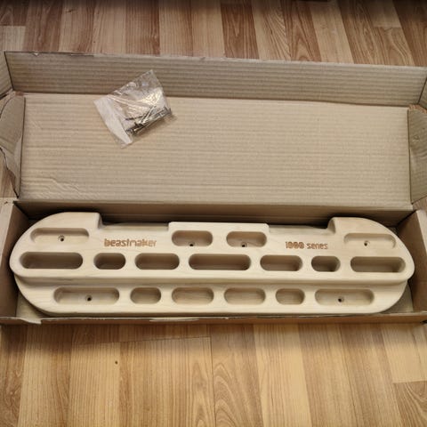 Kiipeilyn vähennyttyä tää 2000 on käynyt turhan vaikeaksi ja jäänyt lähinnä koristeeksi. Vaihto onnistuu 1000 malliin! Takaa koverrettu muutaman reiän ympärystä ettei kipsilevyyn laitettavat ankkurit työnnä lautaa pois seinästä.