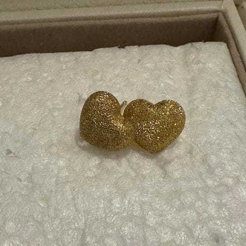 – 2 luonnollista Golden South Sea -helmeä, suolaisen veden alkuperä, noin 9,2 mm halkaisijaltaan, pyöreitä, erinomaisella kiillolla. Niiden pinnalla esiintyy luonnollista pilkkuuntelua (kevyt pilkkuuntelu), mikä on yleinen ominaisuus aidoissa helmissä.