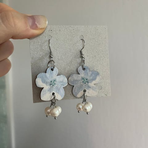 Myydään Never Too Lake -merkin White Whisper -korvikset. Aidot makeanvedenhelmet, kukka koivuvaneria ja koukut kirurginterästä. Korvakorun kokonaispituus 6cm.