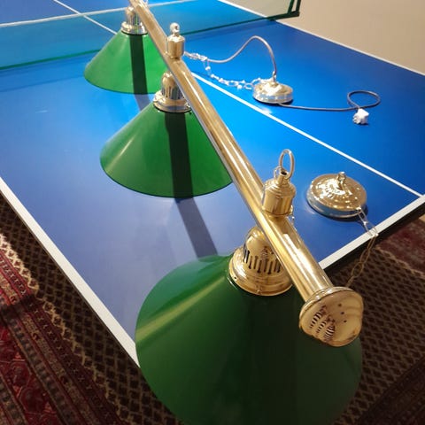 Virvatulen myymä biljardipöydän valaisin, jonka kokonaiskorkeus on n 155cm. Käy myös ruokapöydän päälle ketjua lyhentäen.