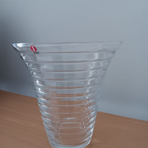 Iittala Aalto maljakko kirkasta lasia. Maljakon muoto on aaltoileva ja se sopii kukkien tai muiden koriste-esineiden esillepanoon. Yläreunassa on kolme pientä kolhua jotka eivät haittaa käyttöä, muuten siisti kunto.
