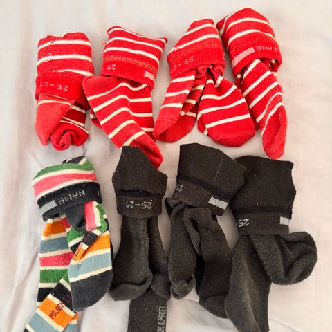 Ostetaan kuvan väriset ja punaiset Polarn o. Pyret jarrusukat koossa 25/27.