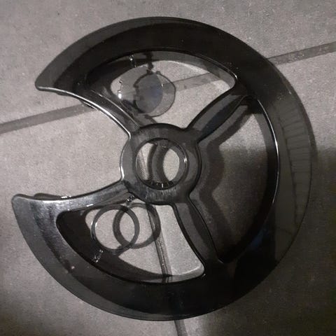 Mustan värinen ketjusuoja kaupunkipyörään tai taittopyörään, tarkoitettu suojaamaan ketjua ja vaatteita.
