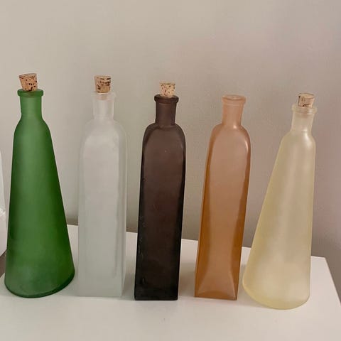 Pienet lasiset pullot esim. oliiviöljyn ja balsamicon säilytykseen ja tarjoiluun. Pullon tilavuus noin 2dl. Hinta yhteensä 10€. Nouto Kalasatamasta.