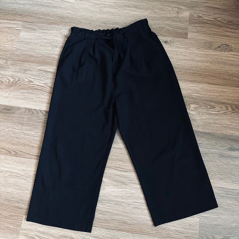 Suorat siistit mustat housut. Vyötärön ympärys 94 cm, pituus vyötäröltä 109 cm.