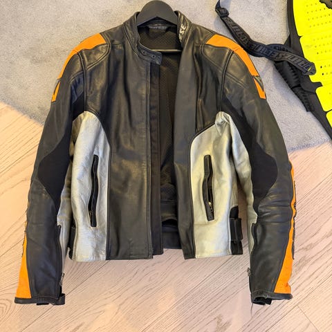 Dainese nahkatakki miesten, ruskea väri. Takissa on vetoketjulliset taskut ja säädettävät hihansuut. Materiaali nahkaa, suunniteltu tarjoamaan suojaa ja mukavuutta. Koko lapussa lukee 54, mutta mielestäni on n.48-50 eli s/m. Olka- ja kyynärsuojat ei tallella.
