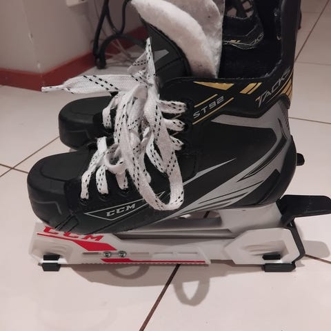 CCM Jääkiekko luistimet lasten koko 35. Mukana tulee kuvissa näkyvät teräsuojat. Oikean jalan luistimen varren takaosassa kangas repeytynyt (kts kuva). Ei kuitenkaan haittaa käyttöä.
