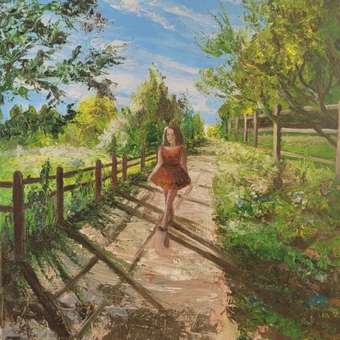 Öljymaalaus kankaalle, jossa on metallisia akryylikorostuksia kultaisen, vihreän ja violetin sävyissä. Kompositio esittää tunnelmallisen maiseman, jossa on selkeä syvyys, ja se on sävyltään lämmin ja hämärä.
