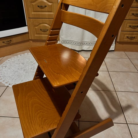 Stokken Tripp Trapp syöttötuoli. Maalipinta kulunut, kuten kuvista näkyy. Muuten täysin ehjä ja turvallinen edelleen, joten maalipinnan uusimalla tästä saisi vielä hyvän tuolin.