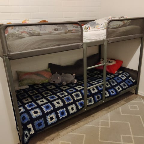Harmaa kerrossänky ilman patjoja. Pari ruuvia puuttuu kaiteesta, mutta pysyy hyvin koossa, aiheuttaa vain pientä kaiteen heilumista. Ikeasta saa ilmaiseksi puuttuvia ruuveja heidän kalusteisiin.