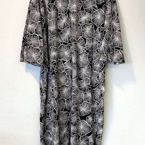 Myyn kauniin pitkän Nanson mekon kokoa L. Mekko on mustapohjaista viskoosielastaania kasviaiheisella vaalealla kuviolla. Kangas joustaa reilusti. Vyötäröllä on näppärät kiristysnauhat ja taskut löytyy. Muutaman kerran pidetty. Mittoja: kai-kai n. 50 cm, vyötärö n. 50 cm ja olka-helma n. 138 cm. Lemmikkitalous.
