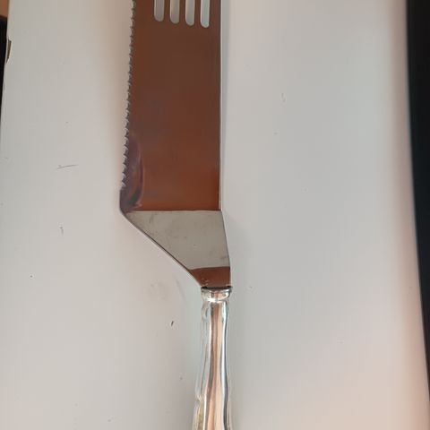 Kuvien voileipäkakkuotin. Pituus on noin 25 cm. Leimattua Suomalaista hopeaa (830). Kaivertamaton.