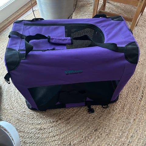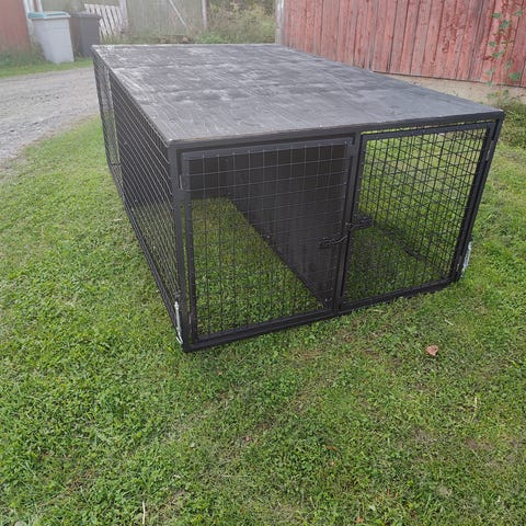 Transporteriin tehty häkki koiralle. Vanerinen pohja. Irrotettava n. 20cm lisäseinä katolle. Leveys 120, Syvyys 100 ja Korkeus 80.