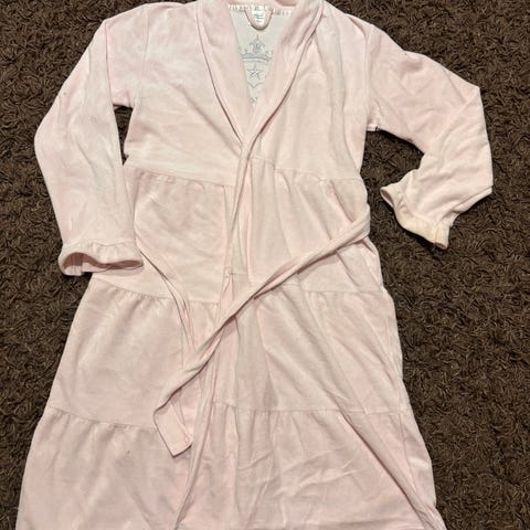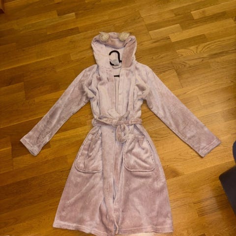 KappAhl vaaleanpunainen lasten aamutakki, koko 152, tytöille. Valmistettu polyesteristä, sisältää elastaania. Kylpytakissa on vyö ja koristeena joutsenkuvio. Ihanan pehmeä.