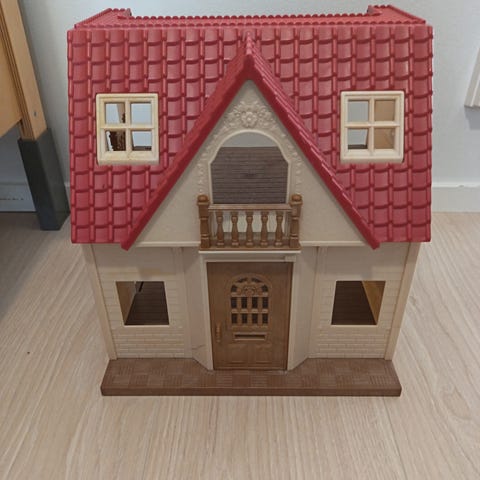 Sylvanian Families lasten leikkitalo, jossa on punainen katto ja koristeelliset ikkunat. Mukana neljä hahmoa ja pieniä huonekaluja. Leikkitalo on kahdessa kerroksessa ja sopii lasten leikkeihin. Koristeltu tarroilla, siitä kunto kohtalainen. Yhteen figuuriin ja pariin huonekaluun myös piirretty.