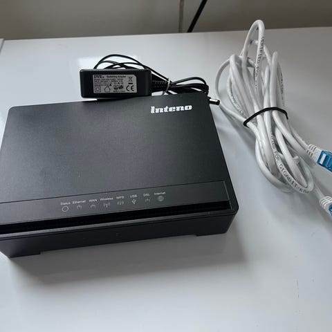 Reititin valkoinen verkko. Laite sisältää virtalähteen ja liitäntäkaapelin. Soveltuu kotiverkkojen käyttöön.