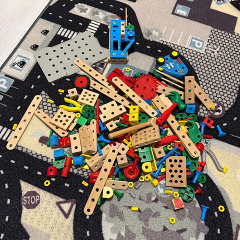 BRIO lasten rakennussarja sisältää erilaisia puu- ja muoviosia, kuten levyjä, pyöriä, ruuveja ja työkaluja. Sarja soveltuu lasten leikkeihin ja rakenteluun.