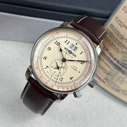 Upea ja klassisesti muotoiltu Zeppelin-kello, LZ-127-sarjasta. Referenssinumero 7614-5. Kellossa on teräsrunko ja se toimii laadukkaalla kvartsikoneistolla. Kellossa on kronografi ja päivämääränäyttö välillä 4 ja 5 tunnin asennossa. Klassisesti muotoiltu ja helposti luettava kellotaulu, jossa on värikkäitä yksityiskohtia.