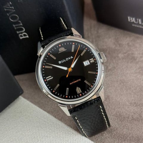Upea miesten rannekello Bulova-merkkiseltä, referenssinumerolta 98A255, malli Hack. Kello, jolla on upea vintage-tyyli. Kello toimii automaattisen koneiston avulla ja siinä on hyvin luettava viisari, jonka kontrasti mustan taustan ja punaisen korostuksen välillä tekee lukemisesta helppoa.
