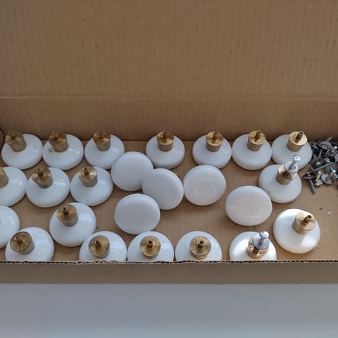 Valkoiset posliinivetimet messinkisellä yksityiskohdalla. Uudet, käyttämättömät. Ovh kpl hinta oli 7€. Koko setti nyt 44€