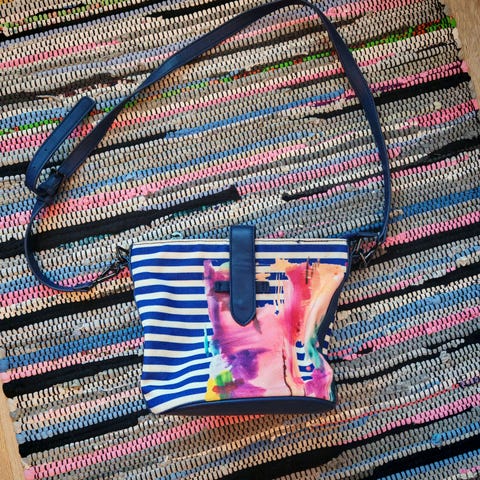 Tyylikäs, hyväkuntoinen Desigual kangaslaukku naisille, musta väriltään ja koristeltu valkoisilla kuvioilla. Laukussa on useita taskuja ja säädettävä olkahihna. Sisällä vetoketjutasku. Ulkopuolella neljä pienempää taskua (magneettisulkijat). Laukussa lyhyt olkahihna kiinteästi ja mukana erillinen pidempi olkahihna. Materiaalina kangas. Vain nouto.