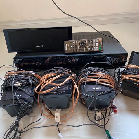 Sonyn kotiteatterijärjestelmä neljällä kaiuttimella (jalka tai seinäkiinnitys),etukaiuttimella, bassolla ja itse soittimella. Taka-kajarit langattomalla järjestelmällä.