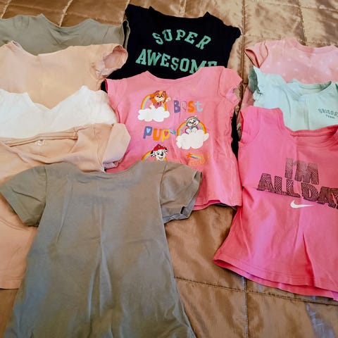 Lastenvaatteet tytöille, koko 98. Kuvassa erilaisia vaatteita, kuten pitkähihainen paita, neule, housut ja huppari. Värit vaihtelevat punaisesta, valkoiseen, vaaleanpunaiseen ja kukkakuoseihin.