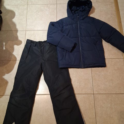 Toppatakki 140 ja toppahousut 150. Takkia käytetty enemmän ja housuja ei juuri ollenkaan. Housuissa henkselit ja lahkeissa vetoketjut (laskettelumonojen päälle)