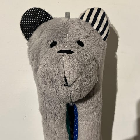 Useammalla lapsella käytössä ollut, mutta edelleen hyvin toimiva Wishbear. Nallen pään sisällä on suhiseva koneisto, jonka saa irroitettua, kun nallea haluaa pestä. Käsin pesu. Nyt jotakin jälkeä, mutta lähtee varmasti pesussa. Nallen jalkojen avulla saa esim. Pinnasängyn laitaan kiinnitettyä.