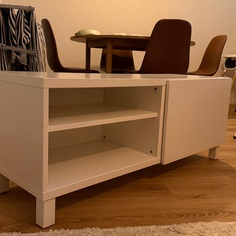 Jysk TV-taso valkoisella värillä. Kalusteessa on kaksi tasoa, jotka tarjoavat tilaa elektroniikalle ja muille tarvikkeille.