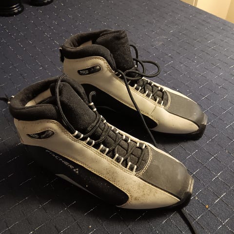 Mustahopeanvärinen Fischerin hiihtokenkä. Lämmin vuori. Kengän koko 39. Sopii normaaleihin, kapeisiin suksiin. Kärkiside.