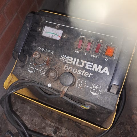 Biltema Booster akkukäynnistin. Laitteessa on virtakytkin, start-painike ja mittarit akun tilan seuraamiseen. Sopii auton akun käynnistämiseen sekä lataamiseen
