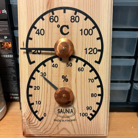 VARI sauna thermometer. The metal is in good condition, but the needle needs either calibrating or replacing.