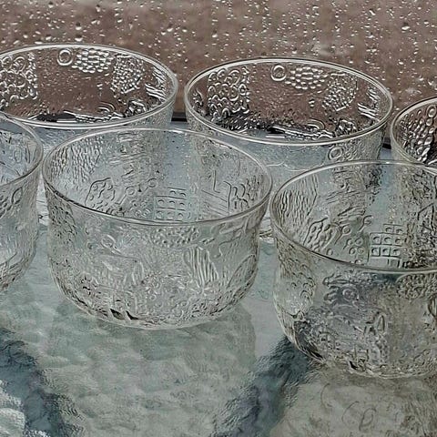 Nuutajärvi, kirkas Fauna jälkiruokakulho 6 kpl, korkeus 6 cm, halkaisija 9,5 cm. Suunnitteilja Oiva Toikka, tuotannossa 1970-1976.