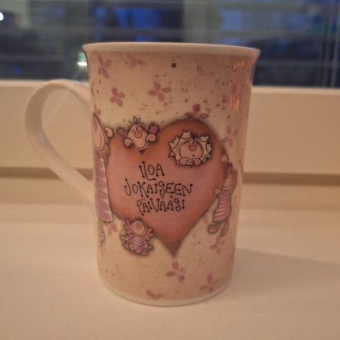 Myydään hyväkuntoinen enkeli muki jossa teksti: Iloista päivää ja hyvää mieltä.