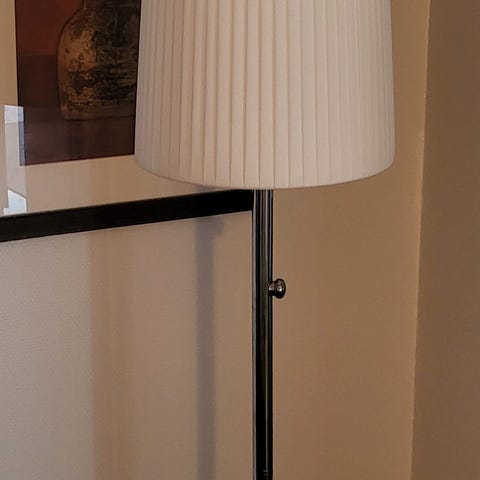 Tilan puutteen vuoksi myynnissä. Korkeus 143cm. Valaisimen kuvun leveys alareunassa 45cm.