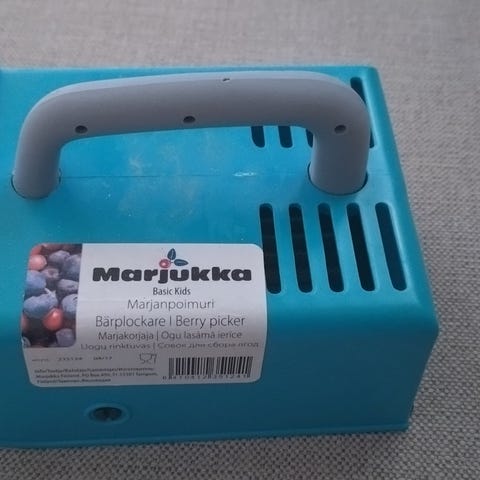 Kerran käytössä ollut punainen lasten marjapoimuri. Postitan.