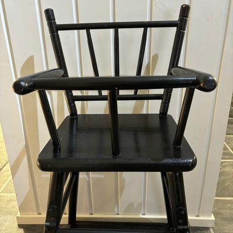 Hyväkuntoinen valkoinen puinen syöttötuoli.