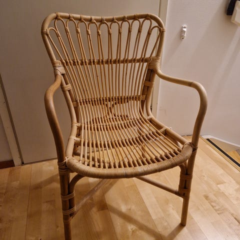Uutena kotimaiselta valmistajalta ostettu rottinkituoli, jossa hyvä istua. Tuunata voi itse taljoilla ja tyynyillä. Kunto moitteeton, savuton koti. Nouto, kulkeutuu pääkaupunkiseudulla tarv.