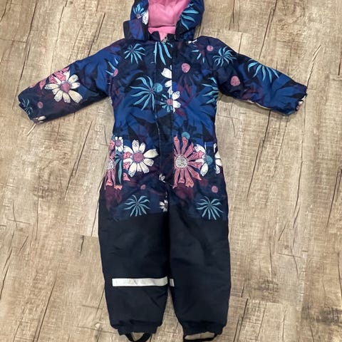 Tytöllä yhden talven käytössä ollut, vielä muhkea talvihaalari. Jalkalenksut. Nouto ovenkahvasta Paloheinästä. Mp. Mmm.