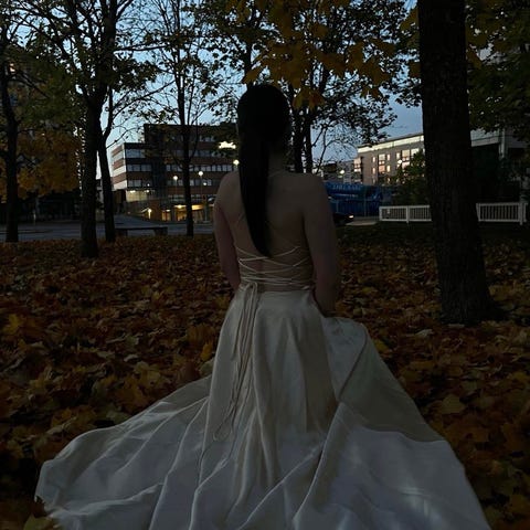 Hienosta silkistä ateljeetyönä valmistettu juhlapuku. Hieno puku vanhojen tansseihin, ja sen jälkeen juhlapuku mihin vain tilaisuuksiin. Sopii ainakin 160 – 165 –pitkille, jos haluaa ulottuvan lähelle lattiaa. Selkäpituus 135 cm. Mukana tulee kaksi erilaista vyökangasta. Saatavana myös vain pari kertaa käytetyt juhlakengät, jotka sopivat puvun väreihin. Koko 36-37, hinta 30 euroa. Jos mahdollista, kannattaa tulla katsomaan ja koettamaan. Katso myös muut ilmoitukseni!