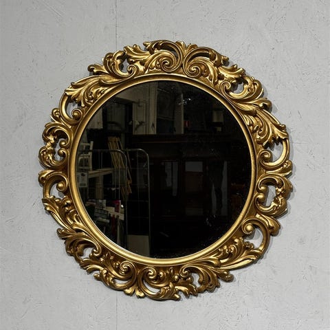 Tyylikäs vintage-peili, jossa on koristeellinen kultakehys. Kehyksen yksityiskohdat tuovat esiin klassisen muotoilun, joka on ollut suosittu vuosikymmenten ajan.Tämä peili edustaa 70-luvun retrotyyliä, jossa kultaiset kehykset olivat erityisen suosittuja. Tällaiset peilit olivat yleisiä monissa kodeissa ja toivat tilaan arvokkuutta ja tyyliä.Peilissä on havaittavissa kulumaa ja pieniä naarmuja kehyksissä.50x60cm.