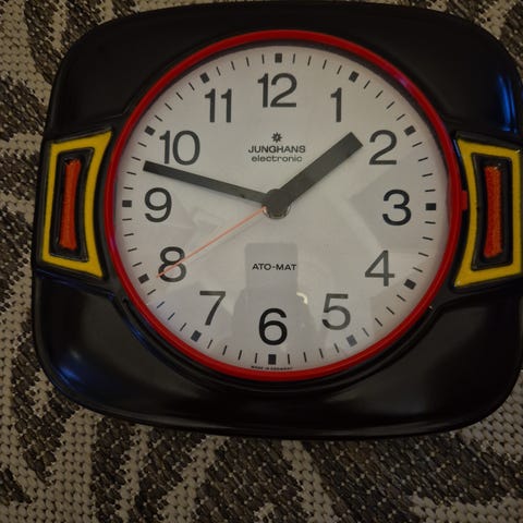 Junghans ato-mat seinäkello. Runko tammiviilua 30x30 cm. Ikää on, mutta viimeksi seinällä ollessaan pysyi suunnilleen ajassaan. Takuuta en siitä kuitenkaan anna.