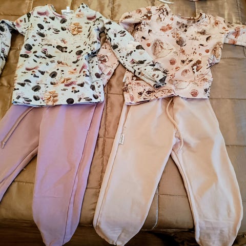 Gugguu lastenvaatteet koossa 104 cm, tytöille. Kuvassa näkyy kaksi pitkää housuparia ja kaksi pitkähihainen yläosa, eri väreissä ja kuoseissa.