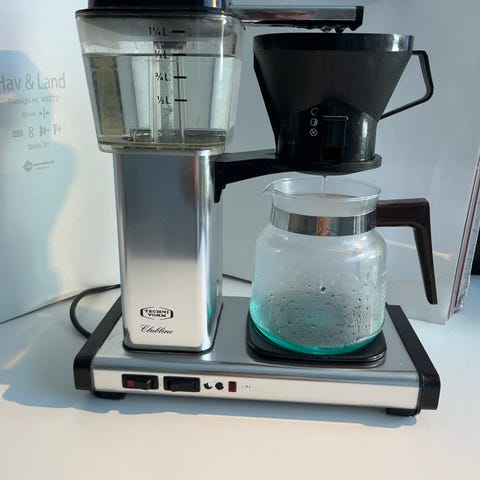 Moccamaster kahvinkeitin mustalla rungolla ja lasisella suodatinkannulla. Laite on suunniteltu kahvin valmistukseen kotikäytössä.