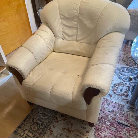 Annetaan nahkainen lepotuoli ja rahi. Hyvä istua, saa myös lepoasentoon. Molemmissa käsinojissa nahka rikki ja tämä näkyy kuvissa. Ei näy päällepäin.
