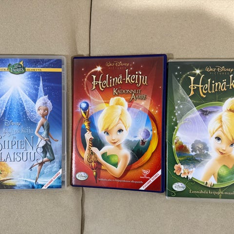 Disney Helinä-keiju DVD-elokuvat sisältävät kolme elokuvaa: Helinä-keiju ja kadonnut aarre, Helinä-keiju ja seikkailu kukkulan yllä sekä Helinä-keiju ja kadonneen aarteen metsästys. Elokuvat ovat suomenkielisiä ja sopivat lapsille. Yhteishintaan.
