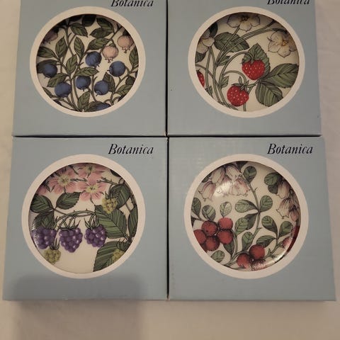 Iittala Botanica koristeellinen lautanen, jossa on neljä erilaista kukkakuvioitua designia. Lautaset on valmistettu keraamisesta materiaalista ja ne soveltuvat koristekäyttöön.