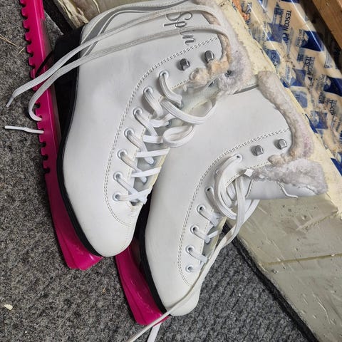 Kaunoluistimet, koko 37, valkoinen väri. Luistimissa on perinteinen nauhoitus ja metalliset terät.