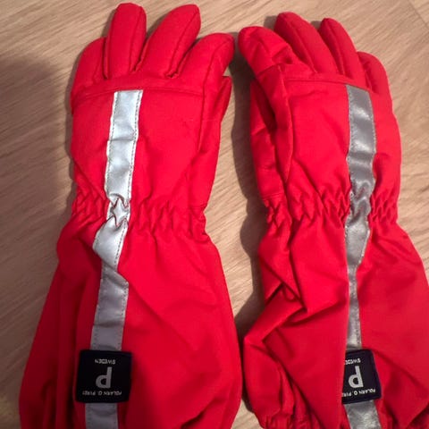Ylärivi oikealla: Polarn o Pyret talvihanskat koko 4. Vasemmassa hanskassa viilto/reikä. Vähän käytetyt.